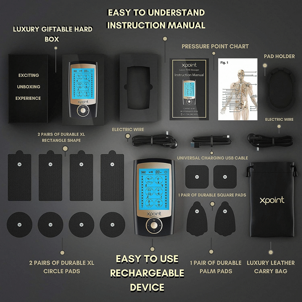 Max power pain relief device, rechargeable physical therapy. With its luxury design and sleek black finish, the Xpoint stimulator is sure to become your go-to device for pain relief. Its dual channel output means that you can target two areas at once, or use one channel for a more targeted approach.