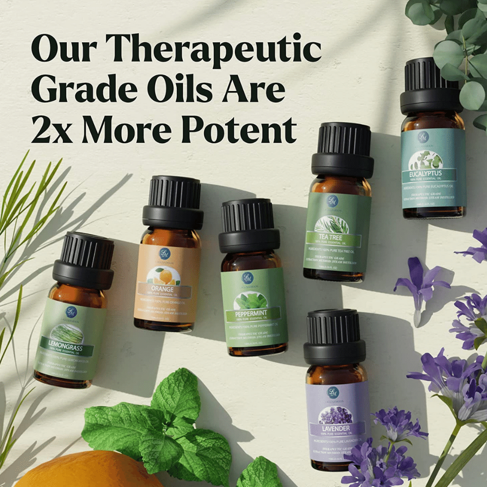 Including Top 10 essential oils include lavender, eucalyptus, tea tree, orange, peppermint, lemongrass, jasmine, nutmeg, clove, and spearmint oils. All oils are therapeutic grade and come in amber 10ml jars to protect from sun degradation.