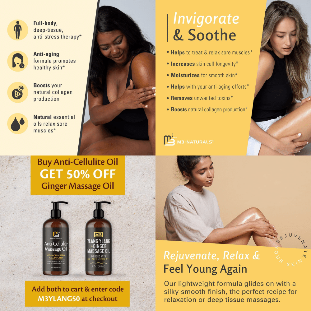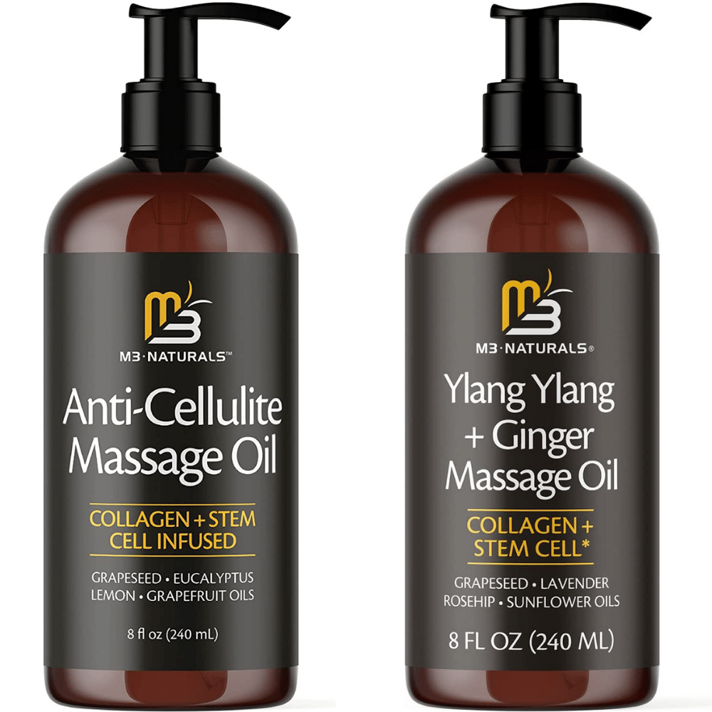 Introducing M3 Naturals anti-cellulite massage oil, an all-natural infused with collagen and stem cell extracts to help tighten, tone, and reduce the appearance of stretch marks.
