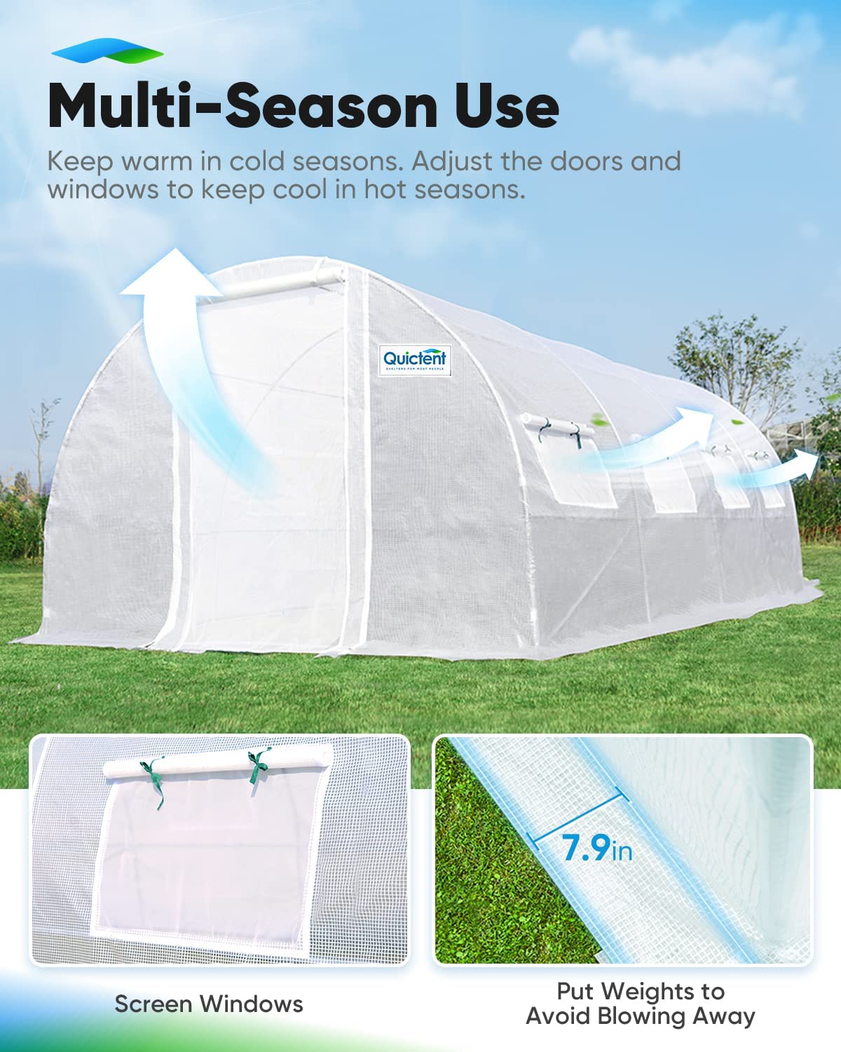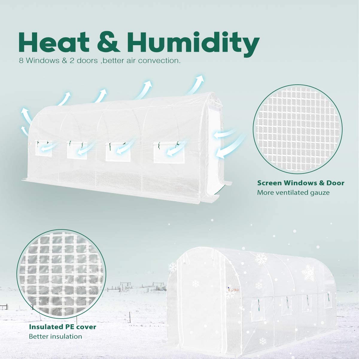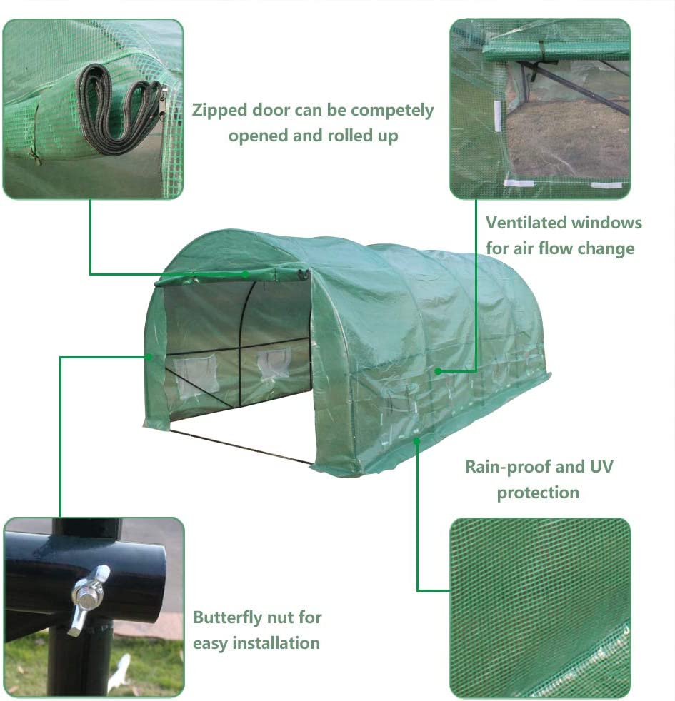 - There are 8 roll-up screen windows and 2 vents on the door to allow for cross-ventilation and heat humidity control. The temperature can be increased in hot house to advance the plant period in spring, 10 vents can enhance ventilation on hot days in summer. The tunnel green house keeps warm in winter and protects plants from storms, wind, snow, frost. The greenhouse offers a better environment for tropical plants and provides a nice home for lovely plants.
