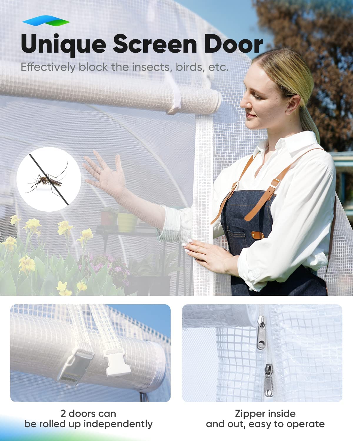 - 2 Entrances on both sides of the greenhouse kits, much convenient and also greatly increases the ventilation. The unique multifunctional doors have 1 PE door and 1 screen door, with independent zippers, you can use the PE door to keep warm and the screen door to stop troublemakers when ventilating. The edge of the cover is 3-layer sewing, which can prevent tearing when using the zipper.