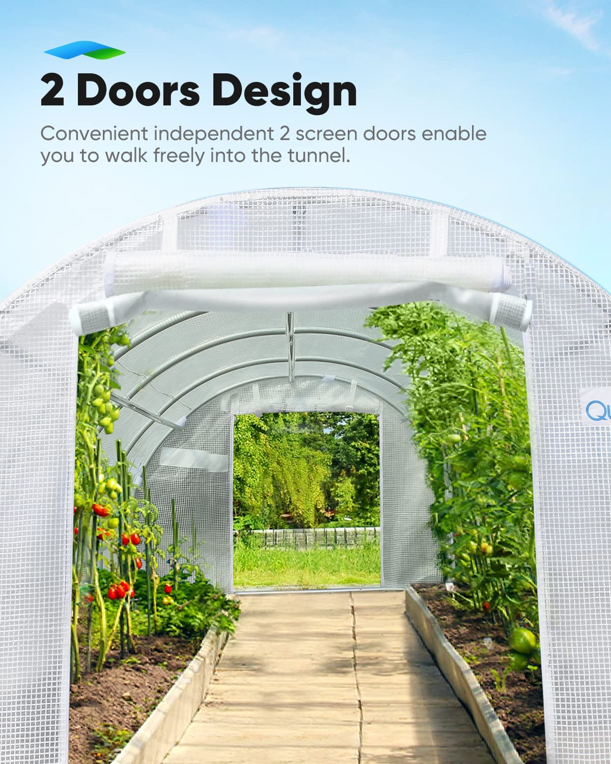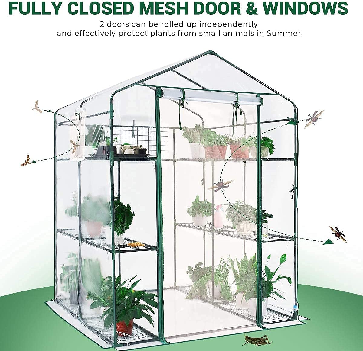 - 2 Doors are included. One screen door can keep small troublemakers out and protect the plant, and one PE door keeps warm completely in winter. Two doors can rolled up independently, convenient to use.