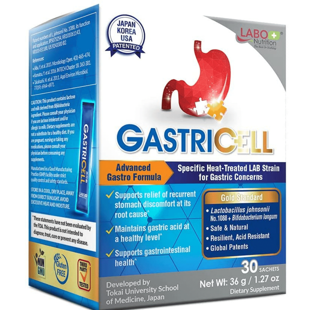 GASTRICELL is a unique product that contains a novel LAB discovered in the body of healthy individuals. This ingredient is responsible for maintaining the stomach's natural pH balance and providing long-term relief from gastric discomfort.
