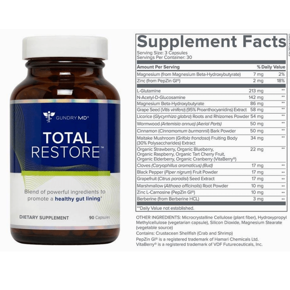 Please use as directed. Gundry MD Total Restore is a unique and powerful supplement that has been formulated to help support optimal gut health. The combination of ingredients helps to soothe the digestive tract, reduce inflammation, and promote healthy probiotic bacteria.