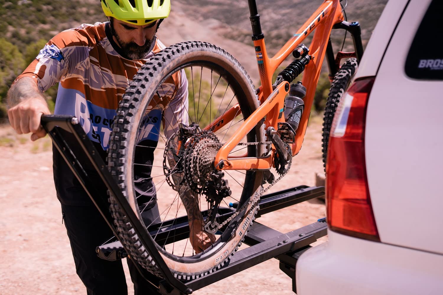 - Add-On Bike can be loaded asymmetrically to eliminate handlebar interference No contact with frame or fork, secures bicycle by contact with tires only carries 19mm road tires up to 3.0” wide mountain bike tires, and diameters from 20” to 29” compatible with bicycle wheelbases from 36” to 55” folds flat against the vehicle, and tilts down 30 degrees to allow for hatch access