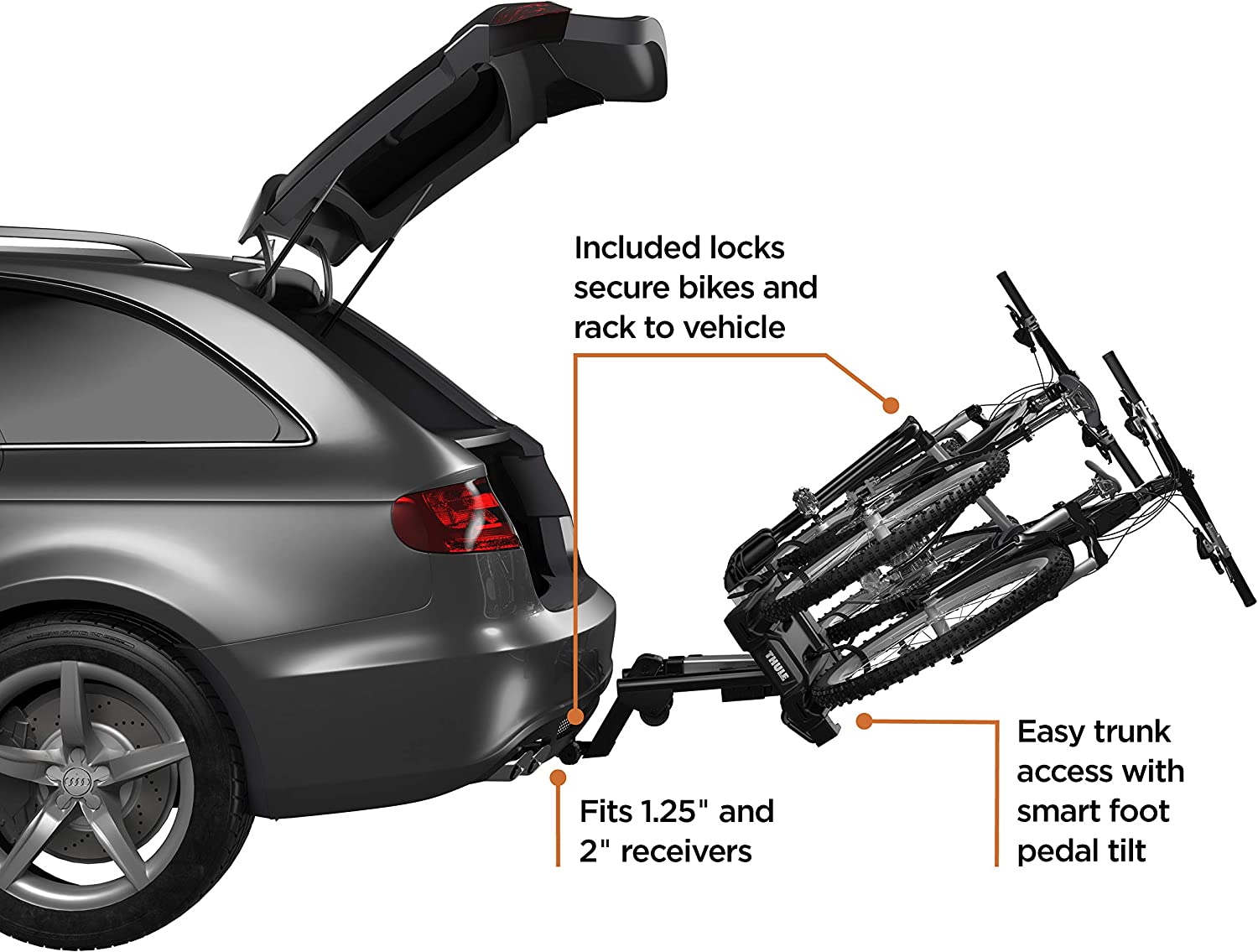 - Easy trunk access with smart foot pedal tilt | Lock bikes to the rack and rack to the receiver (locks included)