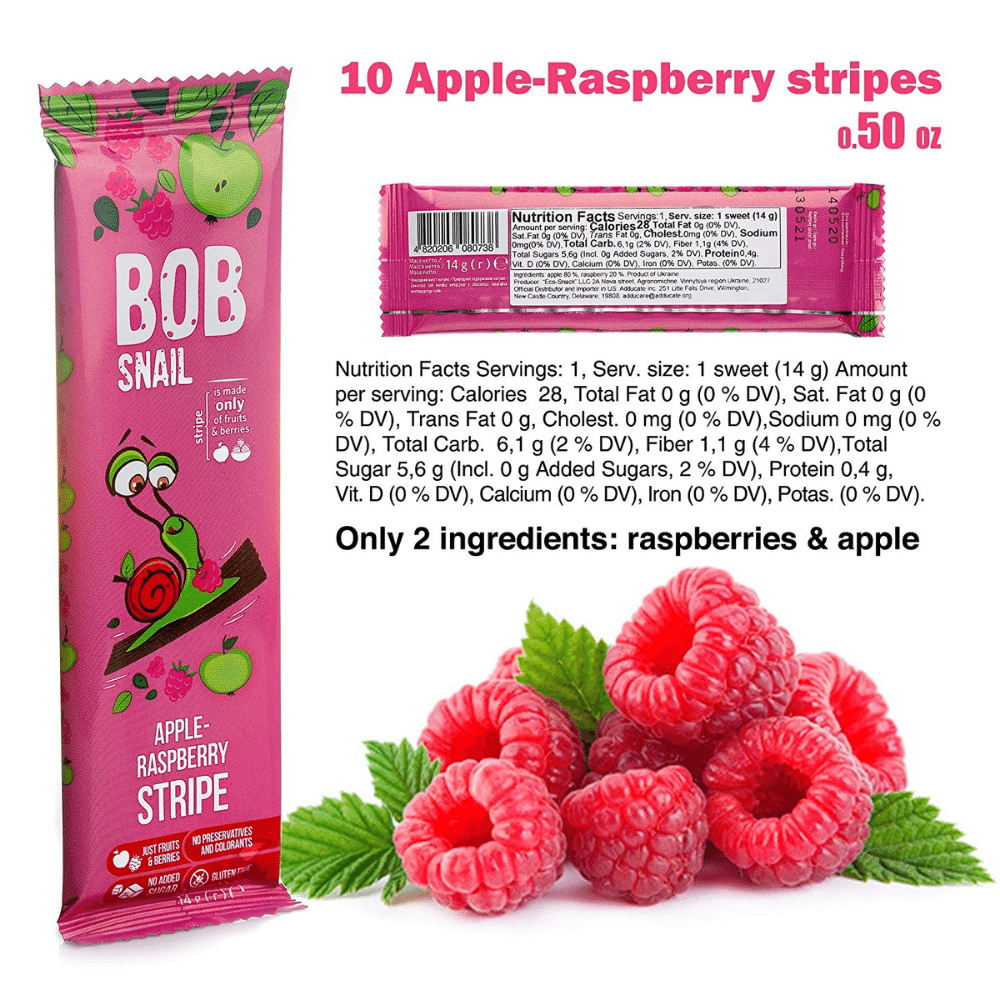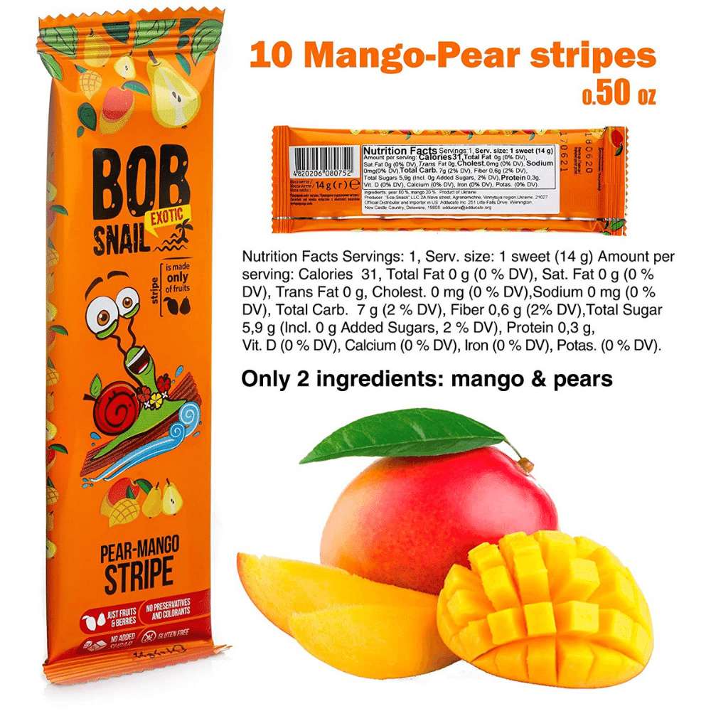 Bob Snail Snacks Variety Pack includes 30 delicious and nutritious fruit bars in three delicious flavors - Raspberry, Mango, and Pear. Each bar is individually wrapped, making it the perfect on-the-go snack.